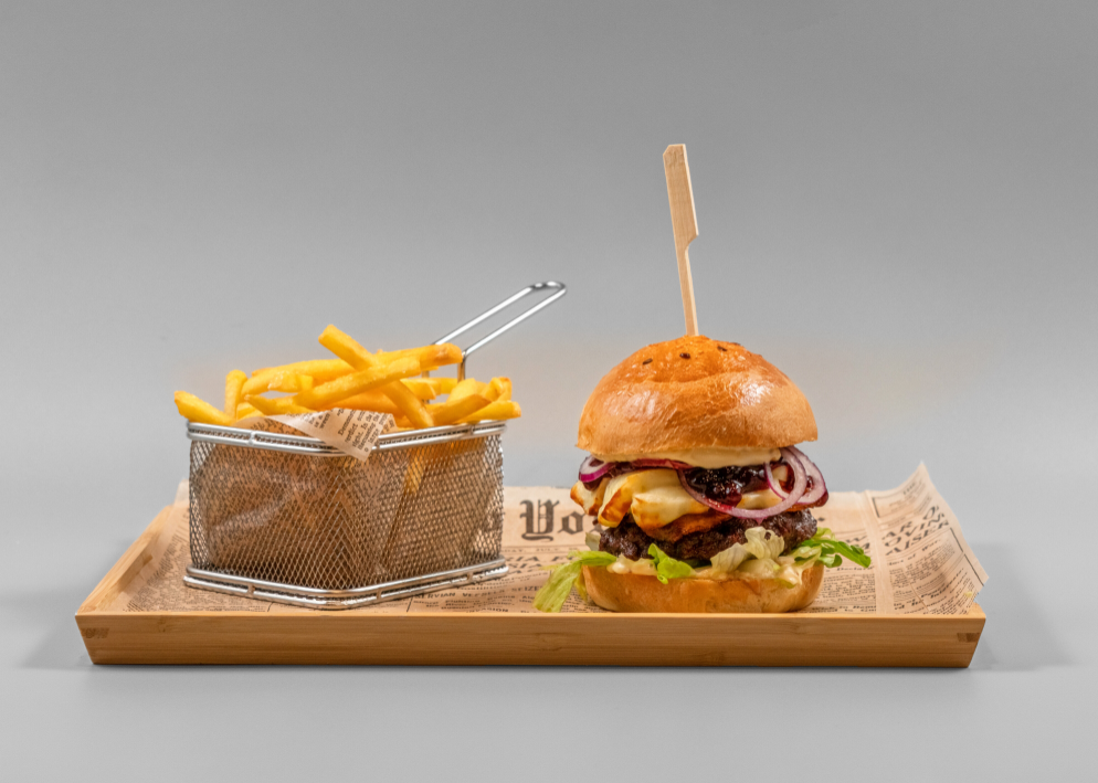 Až se sliny sbíhají. Co říkáte? Náš burger je z mletého Telecího krku a má ještě navíc přidanou hodnotu v podobě cheddaru, který se pokládá přímo na šťavnatou masovou placku. K tomu salát, volské oko, slanina a to vše vložené do housky. Jedním slovem lahoda.
