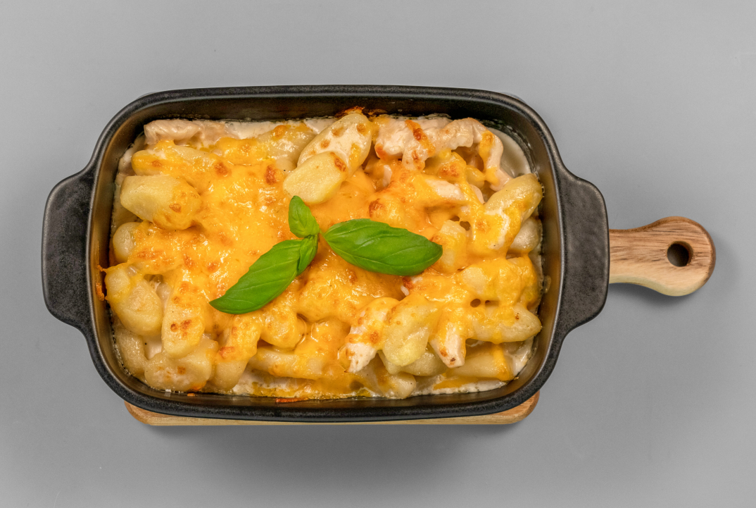 Zapečené smetanové bramborové nočky s kuřecím masem se 3 druhy sýra